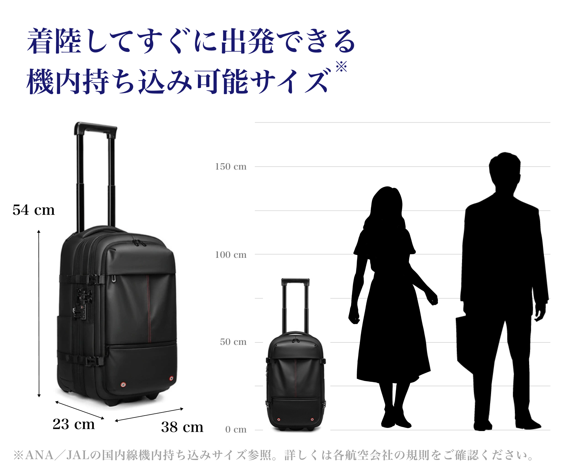 機内持ち込みサイズで、衣類を圧縮収納できる機能を搭載しています。